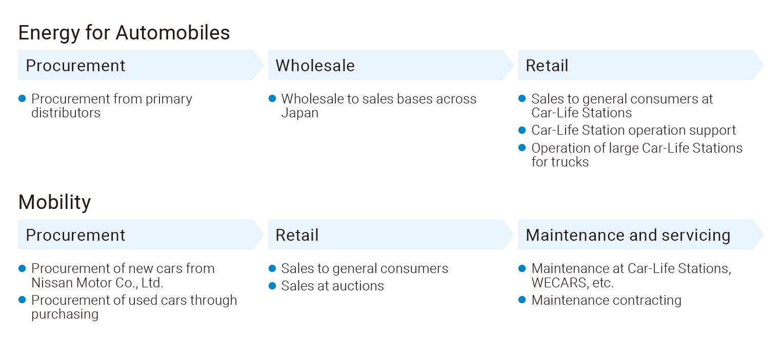 - Gasoline, kerosene, diesel oil, heavy oil, electric power, automotive retailing, living and automotive products/services, vehicle maintenance management services, auto auction