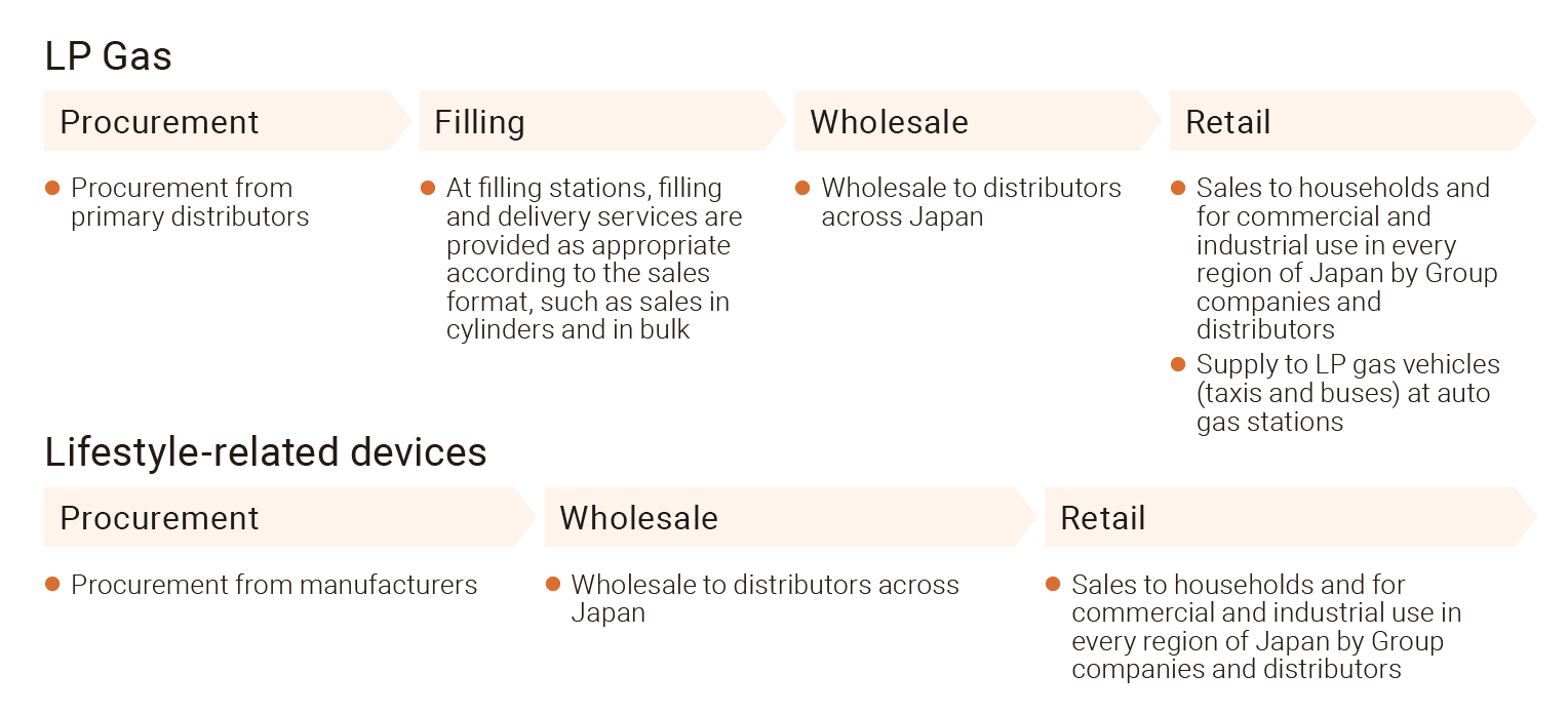 - LP gas, kerosene, city gas (part of Kyushu and part of Kanto region), electric power, household equipment, smart energy devices, and remodeling