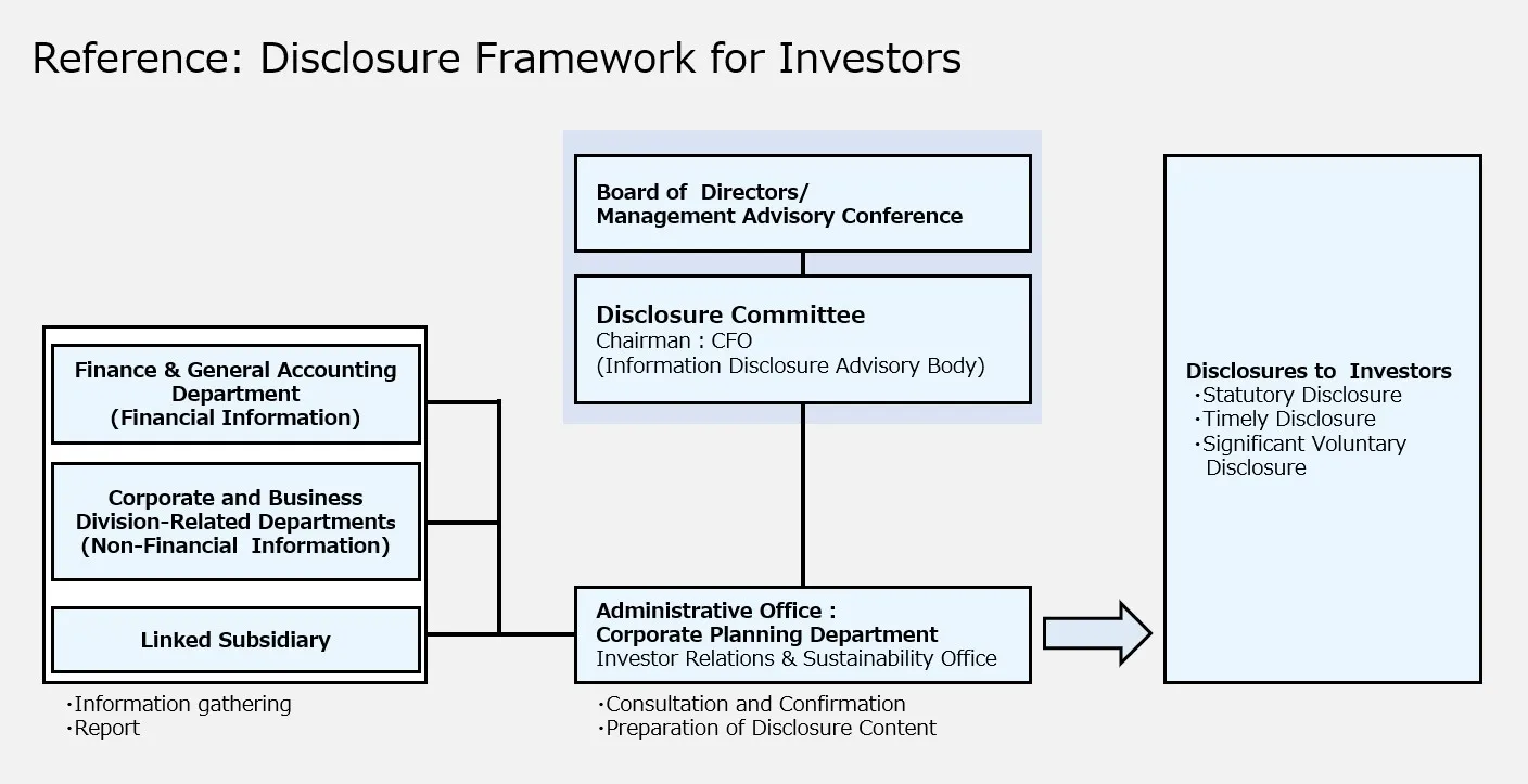 The Company has a Disclosure Committee for the purpose of contributing to appropriate and flexible decision-making by the Board of Directors and Management Advisory Conference, exhaustively and swiftly collecting important company information in the Group, and discussing the necessity of disclosure and the accuracy, clarity, sufficiency, fairness and willingness of the content to release necessary information.
