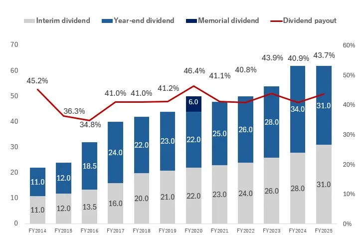The Company has adopted a policy of issuing stable dividends on an ongoing basis as part of its efforts to maintain the sustainable growth of the business, and in our medium-term business plan “ENEX2030 ‘23-‘24”, we have committed to “progressive dividends” and “strong awareness of a consolidated dividend payout ratio of 40% or more”