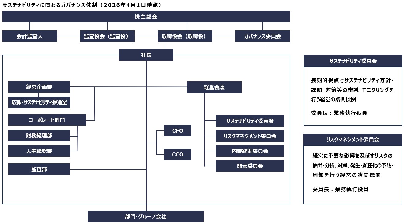 伊藤忠エネクスは2021年にサステナビリティ委員会を設立し、グループ全体のサステナビリティ課題を長期的視点で、審議・モニタリングしております。当事業年度におきましては、気候変動関連を中心に議論を実施いたしました(2024年度開催数3回)。サステナビリティ委員長は業務執行役員が務め、重要な課題については主に経営会議で議論を行い、適宜、取締役会に報告、あるいは必要に応じて取締役会が承認しております。同委員長は経営会議、リスクマネジメント委員会に出席し、事業戦略及び全社のリスク管理においてサステナビリティの観点を反映させております。委員会の委員には職能部長が任命され、また必要に応じて各営業部門の統括責任者も参加し、サステナビリティに関する施策を各組織が迅速に実行する体制を構築しております。