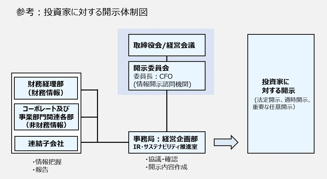 当社では、取締役会・経営会議による適切かつ機動的な意思決定に資すること、当社グループにおける重要な会社情報を網羅的かつ迅速に収集し、開示の要否と内容の正確性、明瞭性、十分性、公正性ならびに積極性を審議し必要な情報を公開することを目的として開示委員会を設置しております。 ・開示委員会は取締役会・経営会議の情報開示諮問機関とする。 ・開示委員長はCFOが務める。 ・開示の実務に係る事務局は経営企画部IR・サステナビリティ推進室が務める。 ・情報取扱責任者はCFOとする。