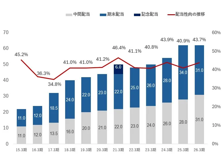当社は経営の持続的成長を維持していく中で、株主還元策として継続的な安定配当を方針とし、中期経営計画『ENEX2030 '23 -'24 』及び『ENEX2030 '25 -'26 』で「累進配当」及び「連結配当性向40%以上を強く意識」を掲げております。